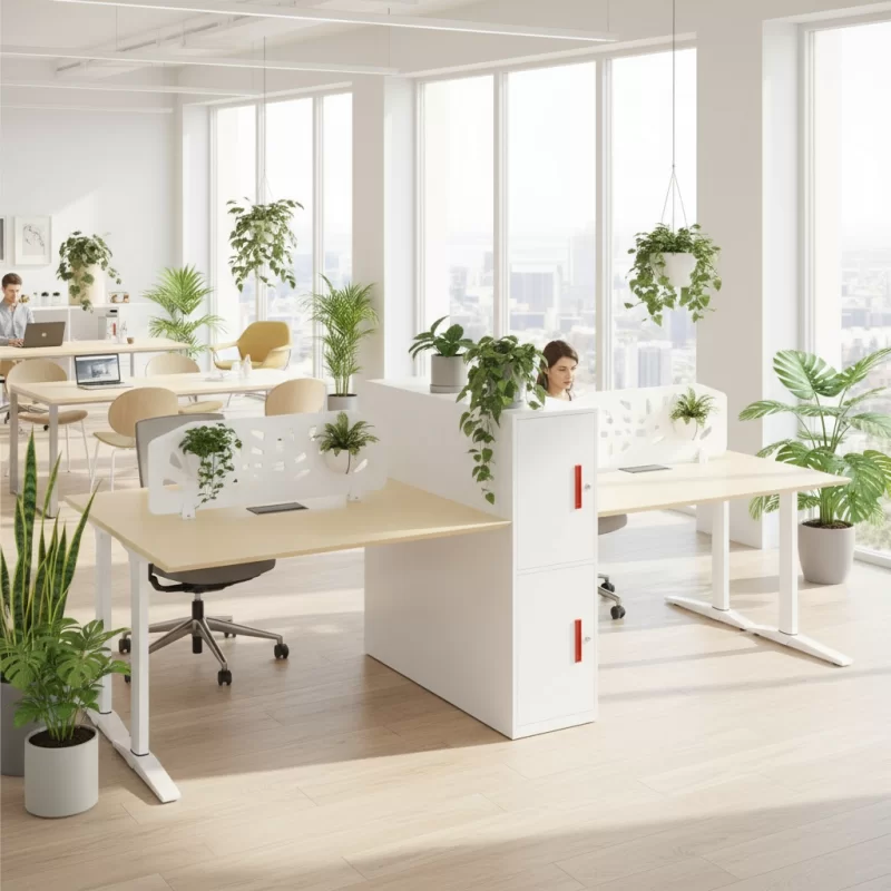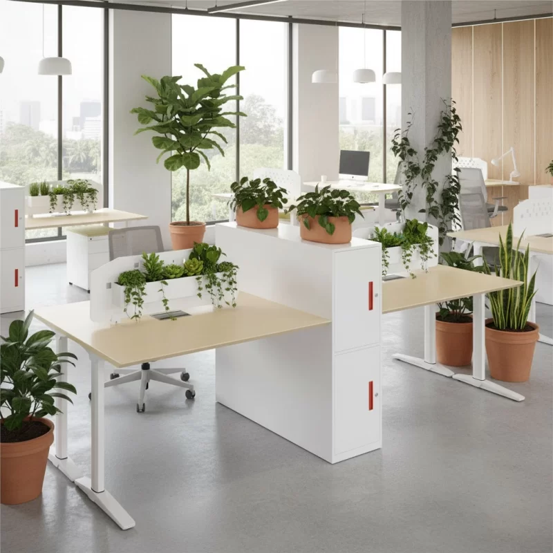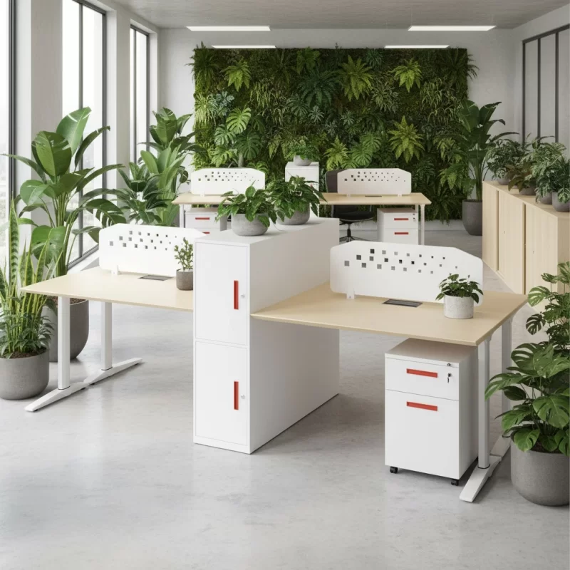 Bàn làm việc chữ nhật cho 4 người , toàn bộ phần chân, vách ngăn và tủ sơn màu S26, tay nắm âm màu cam. Mặt bàn màu M14, có vát cạnh 45 độ phía người ngồi.